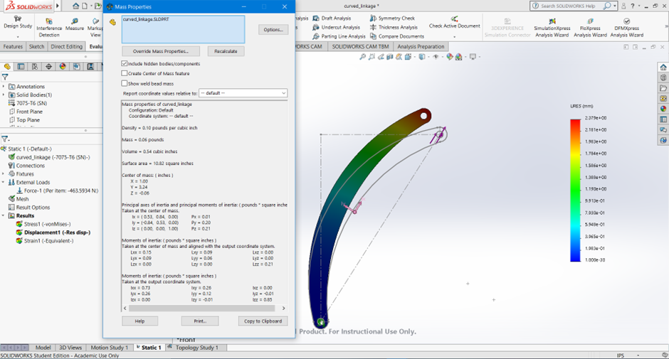 While this linkage had superior stiffness, its weight was higher than the weight of the linkage in Fig 1.5 by 0.007 pounds, so no iterations of the linkage were considered. The final linkage had the best weight-stiffness ratio of all the options considered.