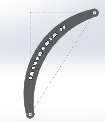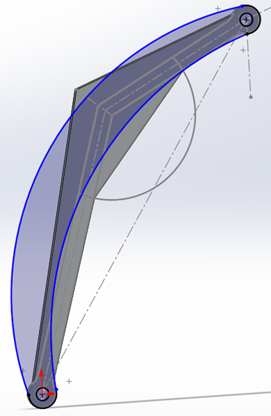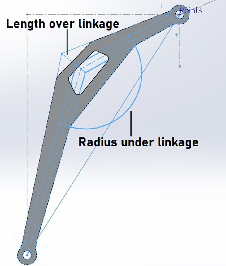 After this final shape was achieved, a fundamental oversight was realised. The shape that FEA testing started with (the old linkage) was a flawed starting point. Solid Mechanics dictates that sharp angles create points of stress, and thus a new linkage was conceptualised using only arcs starting with the connection points, of radii varying by the thickness of the previous linkage.