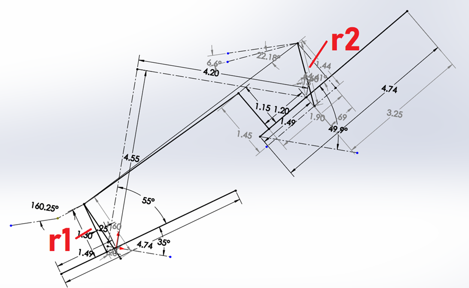 Since the wings need to move through different arcs (the tier 3 element is at a sharper angle in the “high downforce” position) to reach the “low drag” position with the same piston force applied to both (albeit at different angles), the variables must be the moment arms (referred to as r1 and r2 in Fig 1.4) – between the point of rotation (middle hole of the tier 3 insert and first hole of the tier 2 insert) and the point of linkage-insert connection. First, A drawing of all the dimensions was created.