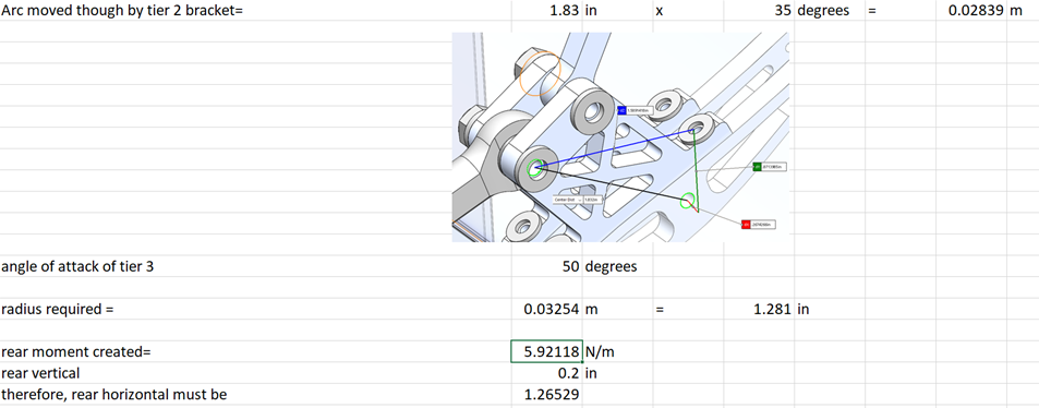 A spreadsheet was then created. Of the two variables (r1 and r2), r1 was kept constant since that was where the piston met the DRS system. The arcs that both the inserts follow must be the same, since they are connected by a linkage. Therefore, by varying r2 we can vary the angle that the tier 3 element moves by. We set the angle that it needs to move by, and we vary the position of the linkage-insert connection point on the tier 3 element while maintaining the required r2. We then find a suitable position for the linkage-insert connection point where the linkage will not interfere with the tier 3 element of the rear wing.
