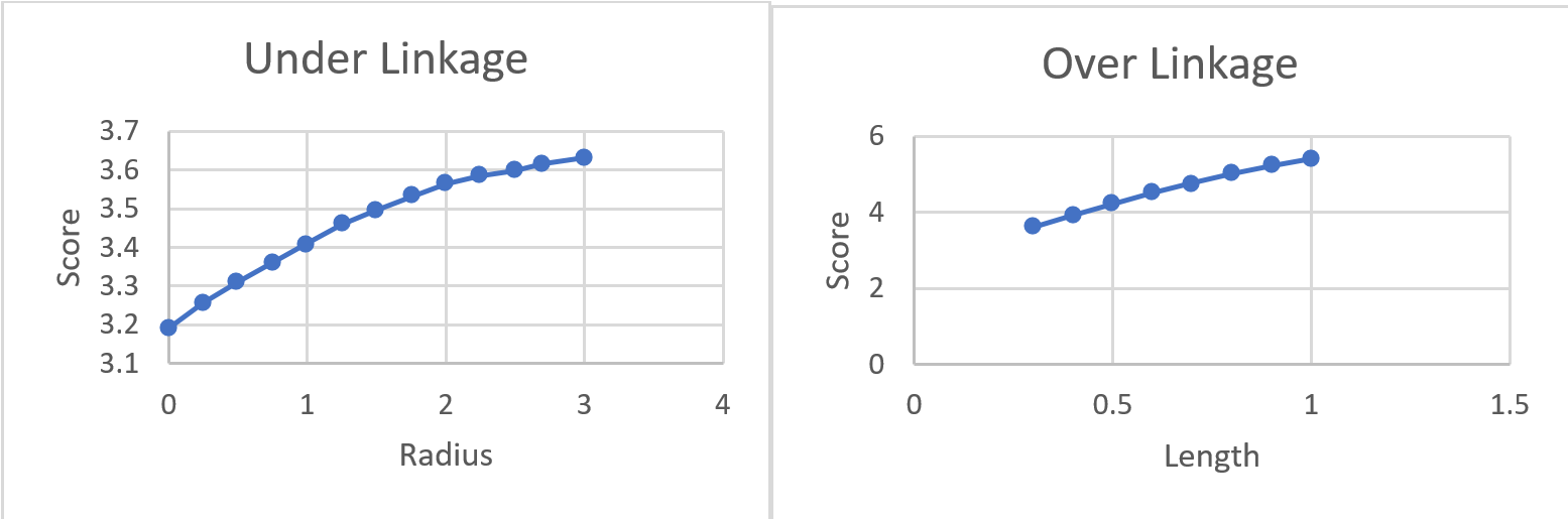 Since changing the insert seems infeasible, stiffening the linkage is the next best option. 1/8th inch 7075-T6 (SN) is the lightest available metal present. FEA studies are conducted extending the linkage upwards (with a length) and downwards (with a radius) as shown in Fig 2.1, and results are graphed as shown in Fig 2.2. Also in Fig 2.2 is the “score” which is calculated as the reciprocal of the displacement of that linkage shown in FEA multiplied by the weight of that linkage. This was done because lower displacement and lower weight is preferred in the final linkage.